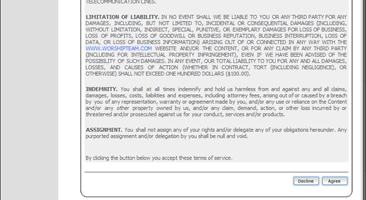 When accessing WorshipTeam.com for the first time, you will have the opportunity to view the License/access agreement online. It will appear in your browser similar to this: