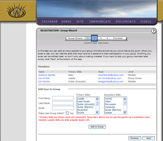 On this step, you can add users to your group. In this step you can add as many people to your group (ministry/church) as you would like at this point. When you enter a user, you can identify skills that they have as it pertains to their participation in your group. Anything you enter can be edited later, so don't worry about making mistakes. If you want to add your group members later, simply click "Next" at the bottom of this step.