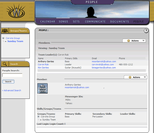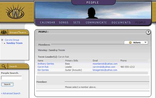 The people section of the Worshipteam.com site is the place where you can view, manage, invite, and remove members to your teams and group. When you first enter this section of the site, you will see a listing of the members that belong in the current team (currently selected group/team context), such as the example below.