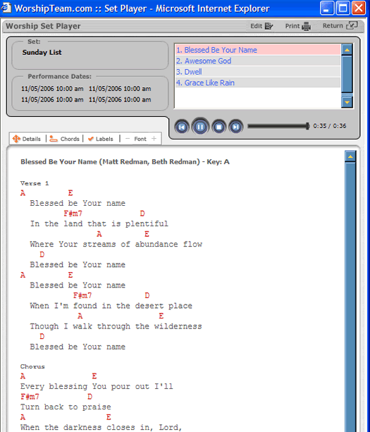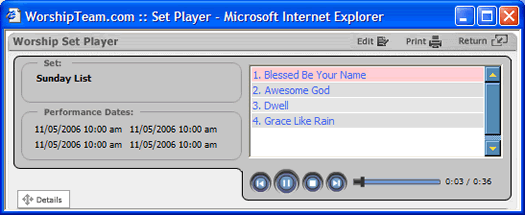 After mouse-clicking on the Launch button from the Practice Pad, the Set Player will be launched. The Set Player launches as a separate window, allowing you to listen to and review your set, while still performing other functions in Worshipteam.com. You can even run it separately, once launched, to allow you to listen to it after you have close Worshipteam.com. The Set Player looks like this: