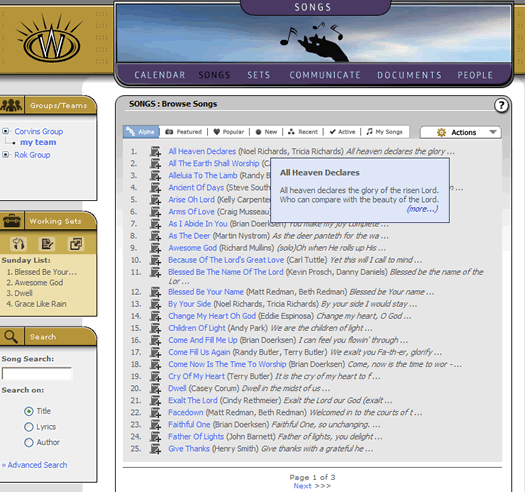 The main landing area for the songs section contains a listing of songs, with various tabs to sort and organize the songs in a way that is helpful to users. There is also a search box on the lower left corner of the screen (there is actually a search function for every section of the website, in case you were wondering). Searching through songs is an especially powerful mechanism, since songs contains such a wealth of information. Explore the search, and try out the advanced search as well. These can very helpful tools in finding the exact song you want.