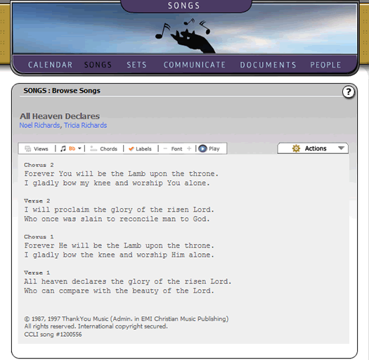 Another obvious control is the audio play icon, which allows you to listen to the song. An important toggle included on the song view is the "Chords" button. Selecting this will toggle the chords of the song in/out of user view, as follows: