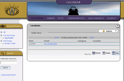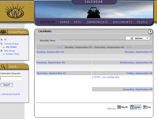 A final view that the calendar provides for us is something called a schedule. This is a much more powerful feature than a date locked calendar, because it involves the ongoing rotation of a repeating event(s) and gives us a grid to plan for weeks or months of recurring events. As it turns out, this is exactly what worship teams do when they play every week-- and the "Scheduler" at Worshipteam.com is perfect for that task. While we won't go into its features in this brief tutorial, it is something that will help the administrators of teams and groups to automatically schedule any number of people or teams (or combinations thereof) for any type of recurring event (like a Sunday or set of weekend services). Because of the power and usefulness of this tool, it is going to be the topic of its own tutorial, to help you discover how it can help your entire ministry or team schedule their recurring events.