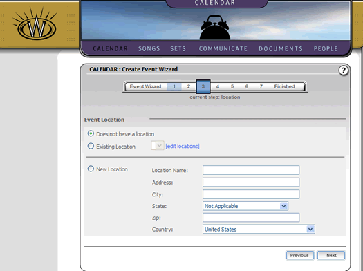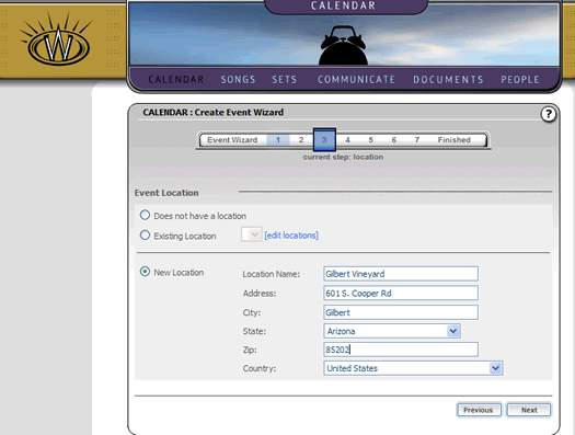 Since this is your first time using the wizard, enter the information for your church location (in our mock event) and be sure to select "New Location" radio button on the left side of the screen. You screen should end up looking something like this: