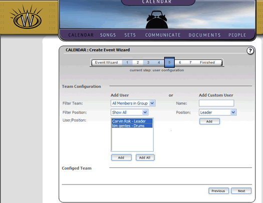 The team configuration is the fifth step in the event wizard. Once again, this step is optional, but it does allow you to specific who you would like to assign to an event.