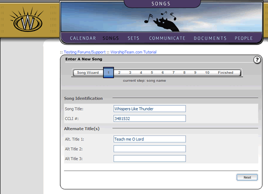 Once you begin a new song, you will enter the "Song Wizard" to step 1. Here you should enter the song title and any alternate titles the song is known by. Be sure to include the CCLI song number if you know this (to allow for tracking of lyric printing for your CCLI usage reports). Fill the information out in the manner seen below, and select the "Next" button to continue.