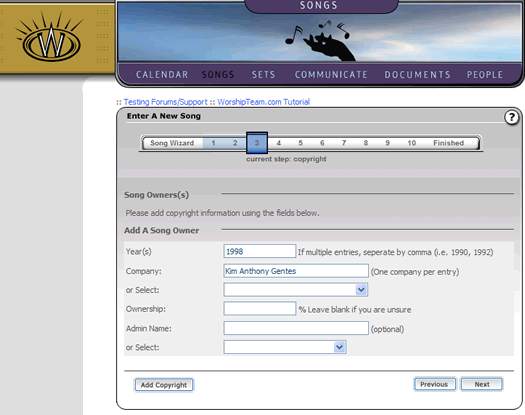 Enter the copyright information here. Enter the year and copyright owner into the boxes indicated. At this point, your input screen should look similar to this: