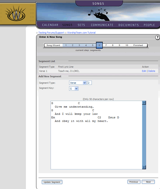 If you add each segment in the sequence it appears in the song, you do not have to change the segment number (which will increment properly if left alone). If the key of the segment is the same as the "key" for the entire song (which you selected in step 5), you do not need to change anything (the song and segment keys are typically not different). Once you have entered a segment, use the "Update Segment" button to save that segment. When you do that, you will see a verification screen appear, such as this: