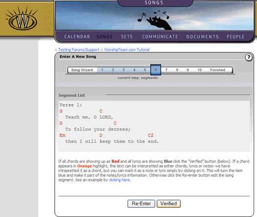 The purpose of this screen is to make sure that the Worshipteam.com chord interpretter correctly recognized the chords you included in your segment. It is guaranteed to find every chord entered. However, some english text and symantics can be syntactically equivalent to a chord. Words such as "Am", which could be found in the phrase "I Am" (referring to the name of God) is syntactically the same as the chord Am (A-minor). The segment chord verification will show you all chords in red. If a chord is a possible questionable chord (could be a conflict, such as a mentioned with Am) it will appear in orange. Chords that are orange are selectable. If you select them, they will be marked specifically as being text, and are not interpretted as chords any longer. Once you have reviewed the segment and are satisfied with the chord and other information in the segment, select the "Verified" button.
