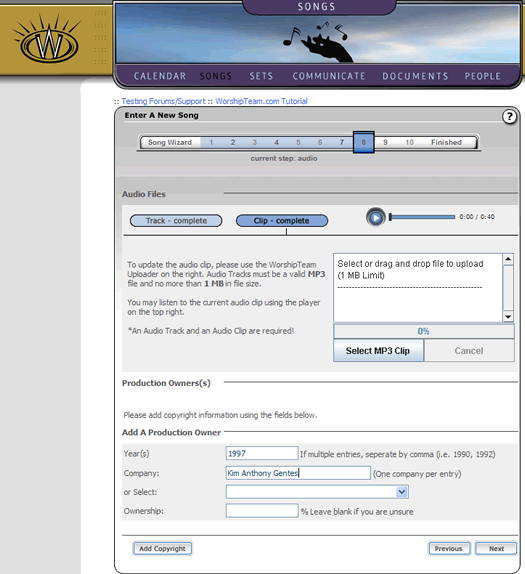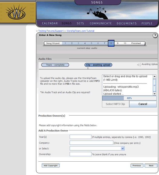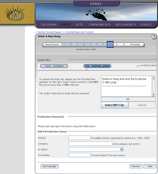 The next step is the song audio. The song wizard will require that you complete this step to have a finalized song added to the songs database. The only audio format that Worshipteam.com will take as input is mp3 files. The size of the file must be less than 5 Mb (megabyte) in size for the full track of the song, and 1 Mb in size for the sound clip. For the file to be processed successfully and used in Worshipteam.com, you need to use either 96kbps or 128kbps bit rate compression. When you first arrive at this screen you will see a blue labeled tab at the top of the audio files screen called "Track - Awaiting Upload" as follows: