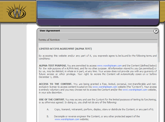 When accessing WorshipTeam.com for the first time, you will have the opportunity to view the License/access agreement online. It will appear in your browser similar to this: