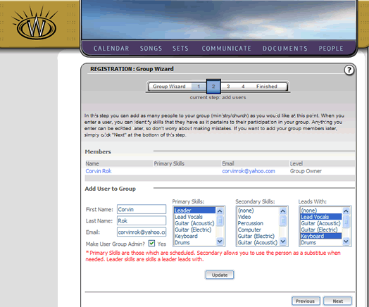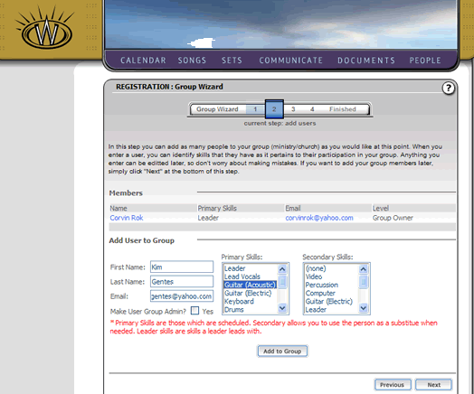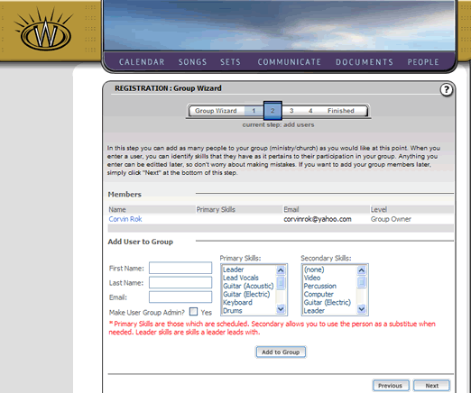 On this step, you can add users to your group. In this step you can add as many people to your group (ministry/church) as you would like at this point. When you enter a user, you can identify skills that they have as it pertains to their participation in your group. Anything you enter can be edited later, so don't worry about making mistakes. If you want to add your group members later, simply click "Next" at the bottom of this step.