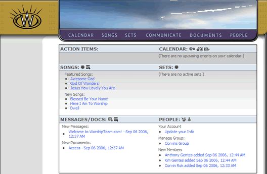 If you would like to begin using your WorshipTeam.com group or teams access, simply select the stylized "W" logo on the top left portion of the web page. This will bring you to the WorshipTeam.com dashboard, which is the main starting page for a working user account. This will look similar to this screen shot that follows: