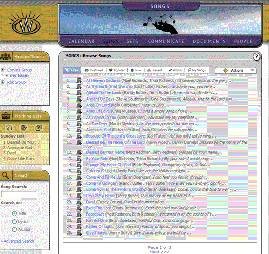 To quickly add a few songs to our set, simply click on the "Songs" section from the main menu bar. Once you land there you will notice a screen with a list of songs. At the beginning of each song listing, (just before the song title) you will see a small icon that is a picture of a scroll (document) with a plus (+) sign on it. If you mouse-over that icon, it will turn gold and a tool tip will appear saying "Add song to set". Simply mouse click onto a few songs of your liking. As you do so, you will note that in the left margin a new box appears called "Working Sets" (it is located directly under the group/team context box). Simply put, this is your set growing, as you click the "Add song to set" icons in the songs area. After you have added four or five songs, your screen should look like this: