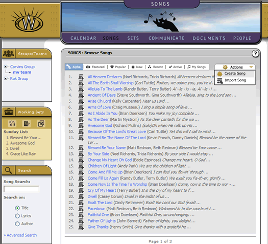 For now, mouse-over the "Actions" menu on the main songs page. Team and group administrators will see the following options appear.