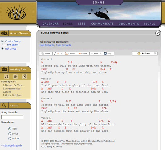 Another obvious control is the audio play icon, which allows you to listen to the song. An important toggle included on the song view is the "Chords" button. Selecting this will toggle the chords of the song in/out of user view, as follows:
