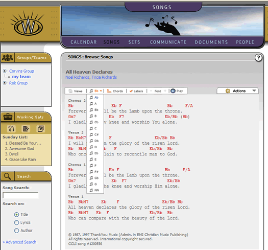 One important menu control is the key drop down. This is identified by a musical note next to the key of the song. Mousing over the musical note graphic will cause the menu to drop down, exposing all the keys you can transpose the chord chart into. In the case of the screen shot below, we transposed the song from the key of A to the key of Bb.