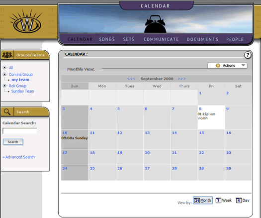 A final view that the calendar provides for us is something called a schedule. This is a much more powerful feature than a date locked calendar, because it involves the ongoing rotation of a repeating event(s) and gives us a grid to plan for weeks or months of recurring events. As it turns out, this is exactly what worship teams do when they play every week-- and the "Scheduler" at Worshipteam.com is perfect for that task. While we won't go into its features in this brief tutorial, it is something that will help the administrators of teams and groups to automatically schedule any number of people or teams (or combinations thereof) for any type of recurring event (like a Sunday or set of weekend services). Because of the power and usefulness of this tool, it is going to be the topic of its own tutorial, to help you discover how it can help your entire ministry or team schedule their recurring events.