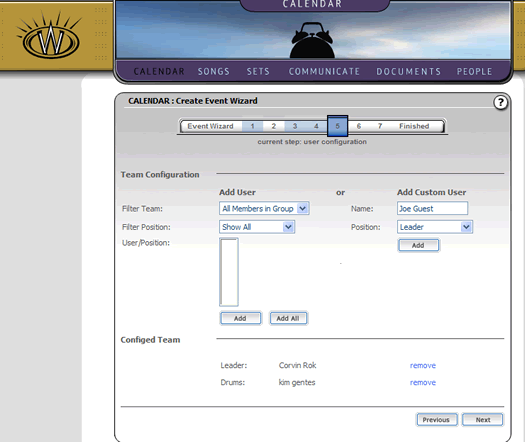 The team configuration is the fifth step in the event wizard. Once again, this step is optional, but it does allow you to specific who you would like to assign to an event.