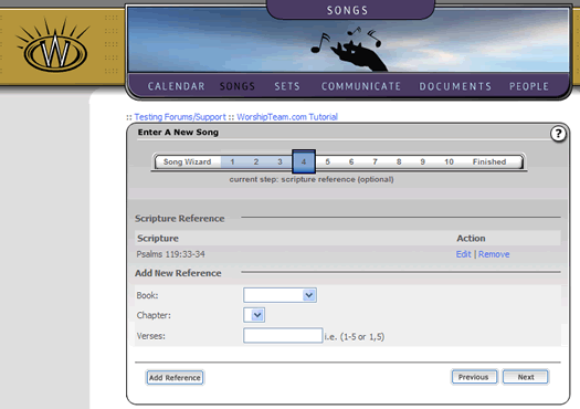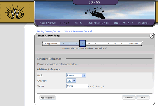 Adding scripture references are an optional step. If a song has one or more scripture references, simply select the book in the drop down first. Then the chapters will be updated to allow the correct range for that book. Select the chapter, and enter the verse(s) from that chapter. At this point, your input screen should look similar to this: