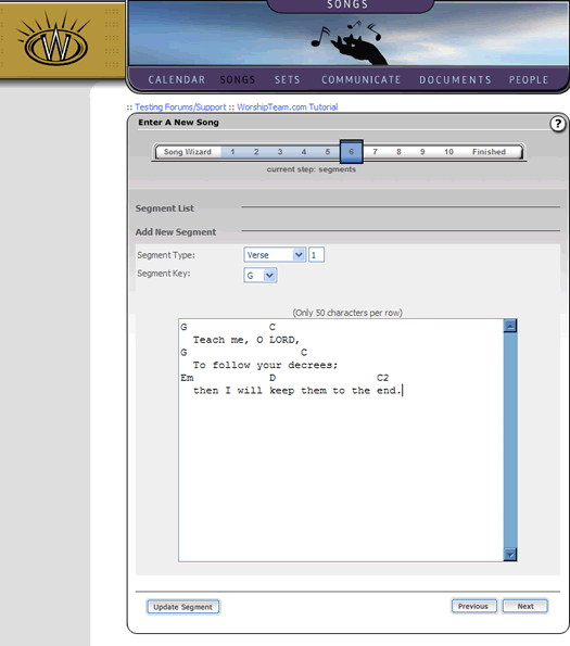 The segment step of the song wizard allows you to add multiple segments to the song. Typically, this means you select the Segment type (Verse begins as the default), then enter the chord/lyrics for that segment in the form as below: