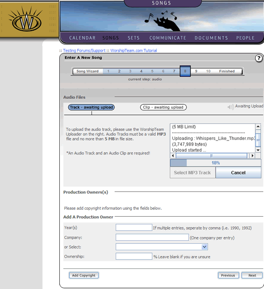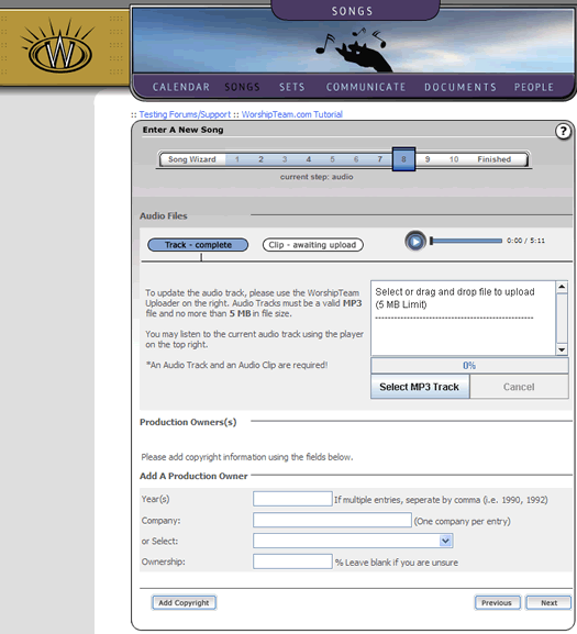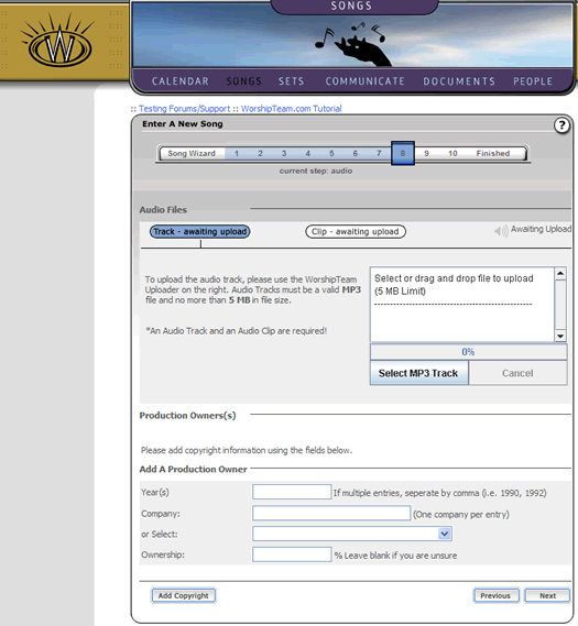 The next step is the song audio. The song wizard will require that you complete this step to have a finalized song added to the songs database. The only audio format that Worshipteam.com will take as input is mp3 files. The size of the file must be less than 5 Mb (megabyte) in size for the full track of the song, and 1 Mb in size for the sound clip. For the file to be processed successfully and used in Worshipteam.com, you need to use either 96kbps or 128kbps bit rate compression. When you first arrive at this screen you will see a blue labeled tab at the top of the audio files screen called "Track - Awaiting Upload" as follows: