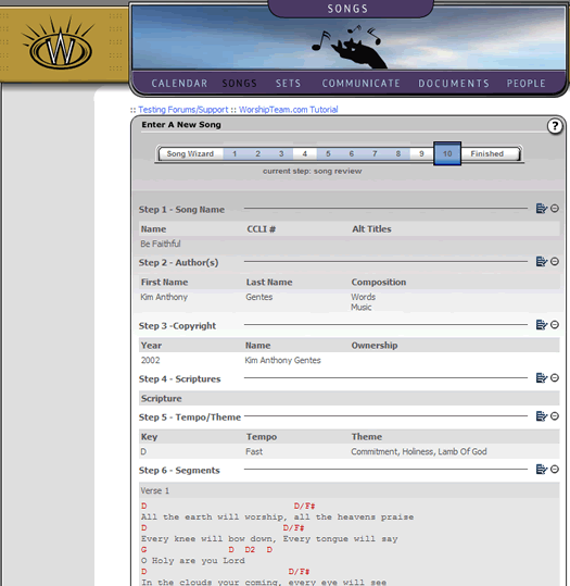Select the "Finish" button at the bottom of the page and your song is completed. If you view your completed song, you should see it appearing correctly.